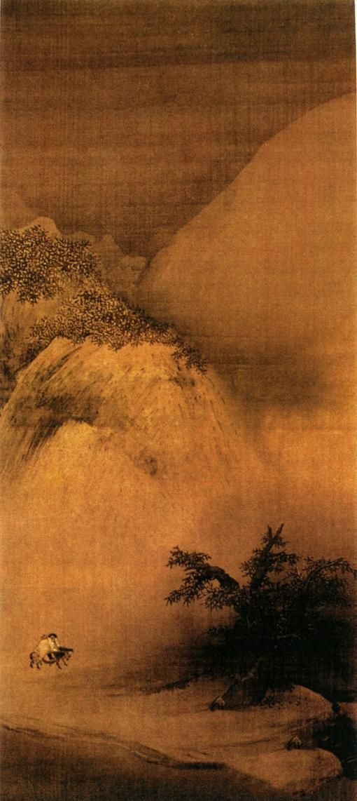 《雪景山水图》:这件作品描绘的是两个旅人在雪天骑驴从山间走过的场景,他们身披白色披风,头戴雪帽,一边走一边交谈,水边两棵老树,其虬曲的枝干和稀疏的树叶,是以细致的笔法刻画出来的。画山石,仿北宋范宽的笔法,以簇点画密林,而山体皴笔甚少,在以淡墨渲染的天空映衬下,给人以白雪皑皑之感。整个画面呈现出荒凉萧瑟的氛围。此图为南宋院体山水画的经典之作。