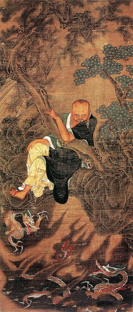《十六罗汉·降龙》简介:绢本,立轴,设色;纵96.4厘米,横50.9厘米;藏于日本相国寺。