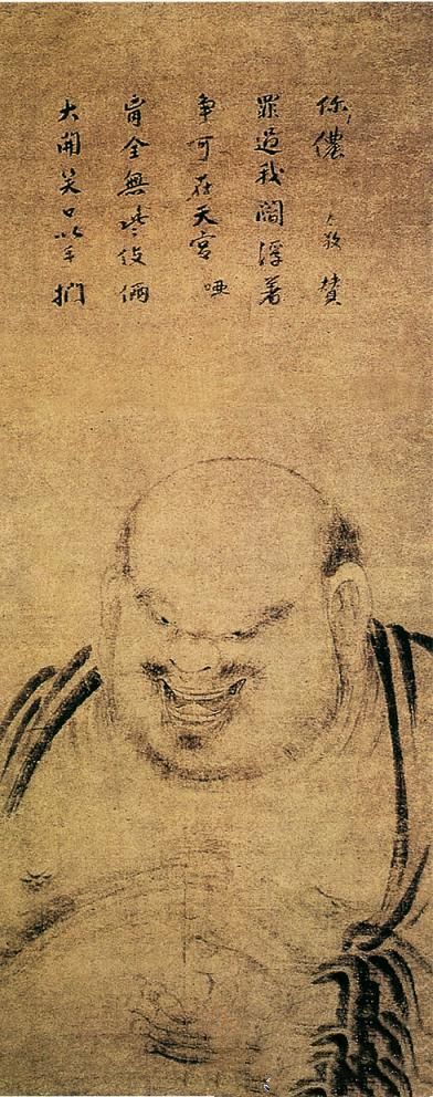 《布袋和尚图》:这幅作品之前我们先来了解下布袋和尚为何许人。布袋和尚为五代后梁时僧人,世传为弥勒菩萨之应化身,南宋时期常被禅宗的拿来作绘画的题材。这幅作品中的布袋和尚为半身像,双手捧腹,作开口大笑状。头部造型准确传神,富有强烈的感染力,衣褶的几笔浓墨,又显出禅宗的随意与自由。