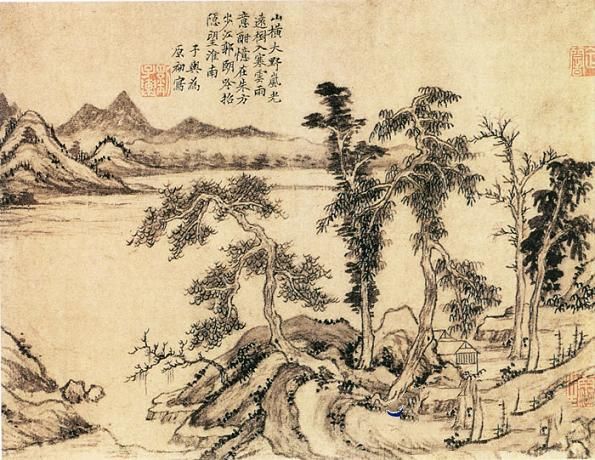 《疏林远山图》:这件作品也是属于《张观等五家集绘卷》之中的一幅,作品中的近岸画的是疏林房舍,陂陀小草,而对岸远则是丛林,中间通过一条河流隔开,笔意疏秀简远。上面有刘堪自己的款识“山横大野岚光远,树入寒云雨意酣。忆在朱方出江郭,朗吟招隐望淮南。子舆为原初写。”