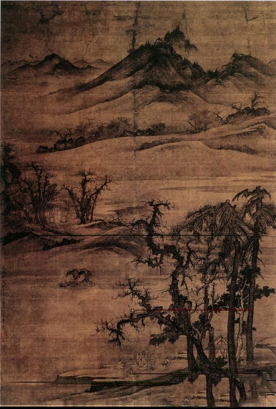 《松荫聚饮图》:唐棣国画风格学宋郭熙之法,这件作品的近景描绘的是河畔的几棵高耸的长松,树从后露出几间茅屋。松荫下有四个人席地而坐,正举杯畅饮。旁有两人手捧壶盘侍候,一人抱矮案前来。对岸的中景是古树茅舍。远景群山蜿蜒。作品中的对饮者解衣盘礴,不拘礼仪,生动地表现出村民野老酒酣兴豪的生活乐趣。作者曾随赵孟顺学画,此图岗峦坡石笔墨圆润婉和,存有赵氏遗法。长松勾勒苍劲精巧,细枝似蟹爪,则是采用郭熙的风格。