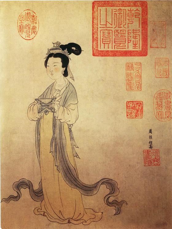 《杜秋娘图》:以上这件作品只是整幅长卷中的一部分,图中杜秋娘唐装高髻长裙,手执排箫独立凝思,其面容丰满端庄,衣带飘拂,婀娜多姿。画家用浓墨重染发髻,衬托出白晰的面容。衣纹用笔细劲飘颇有唐人遗韵,也较好地表现了这位歌舞伎的丰姿与惆怅。