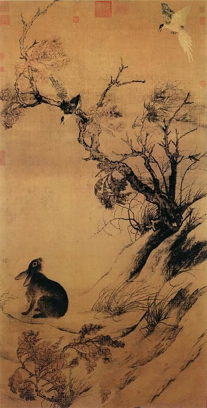 《双喜图》:这件作品亦称《禽兔图》,描绘的是秋风肃杀、枯木槎桠。两只寒鹊(实为绶带鸟)飞临,其中一只刚停于树干之上,立足未定,翘尾展翅。树下一兔,正引首回顾,垂耳张鼻,曲尽其妙。秋兔双禽,高下对峙,互为呼应,浑然一体。画中以半工半写之法,绘枯木、衰草和山坡,兔禽则用笔工细,刻画写实。色彩清淡,体现了前人所说的“体制清淡,作用疏通”的艺术特色。
