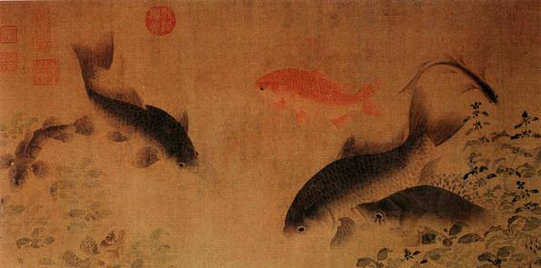 《落花游鱼图》:这是一件非常好的花鸟作品,画中的鱼栩栩如生。作品先画盛开的杏花,伸向水面,向后展开,落花引来群鱼争食,或聚或散,或潜游,或上浮,或回泳,翻藻戏蒲,以示水中的畅泳自然之态。其画法全用渲染,间或用没骨法,不见钩勒,活泼生动。这种表现方法和诗情画意,独创一格,多为后人所仿效。