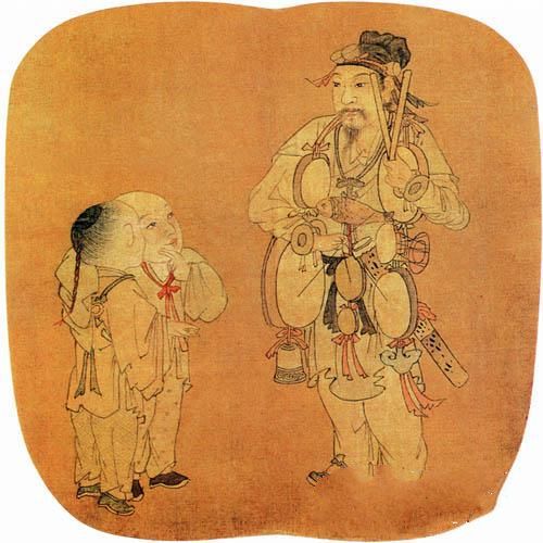 《杂技戏孩图》:这幅作品描绘的是当时的民间艺人在街头卖艺的场景,作品中杂技艺人正施展绝技,口中唱词,手中击节敲鼓,两个小儿不觉被深深吸引住。人物情态刻画得真实自然,表现出画家对民间生活的细致入微的观察力和游刃有余的艺术表现力。