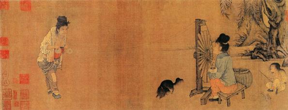 《纺车图》简介:绢本,卷,设色;纵26.1厘米,横69.2厘米;藏于北京故宫博物院。