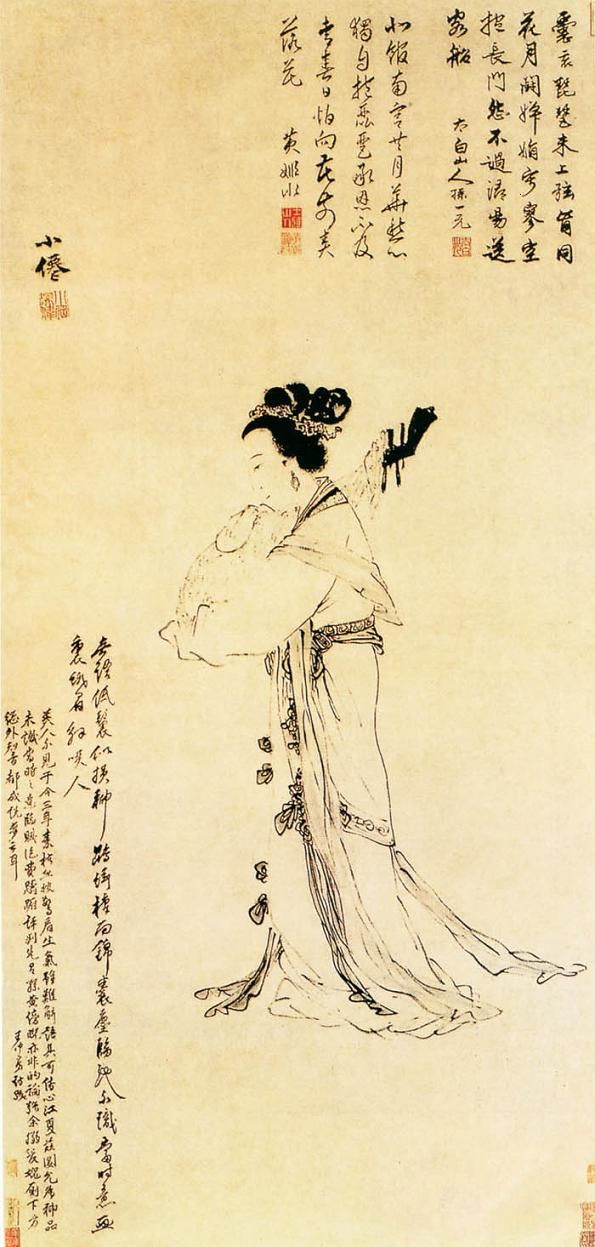《琵琶美人图》:吴伟的这件传世国画作品描绘的是一位侧面低首,神情幽怨哀愁的抱着琵琶的仕女。作者采用近白描的简略笔墨勾画出人物形象,衣饰线条转折流畅,似行云流水,仅在某些局部以淡墨略加渲染。画面无任何背景,主体突出,简洁明快。作品上面上有孙一元、黄姬水等三人题的诗跋,称“江夏兹图,允为神品”。
