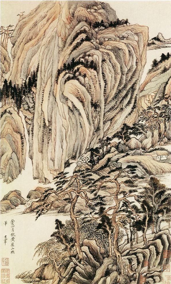 《仿古山水图》:董其昌的《仿古山水图》是一个画册,是他的国画代表作品,这个画册一共是十页,这件作品是其中的一页,作品描绘的是高松陡坡,崇山巨嶂,顶天立地,气势撼人。山石皴法,直抵王蒙解索皴法神韵,细而刚,曲而韧,一波三折。设色浅绛青绿兼用,时而用赫石或以色墨皴写坡丘,超然于王蒙笔墨之上。
