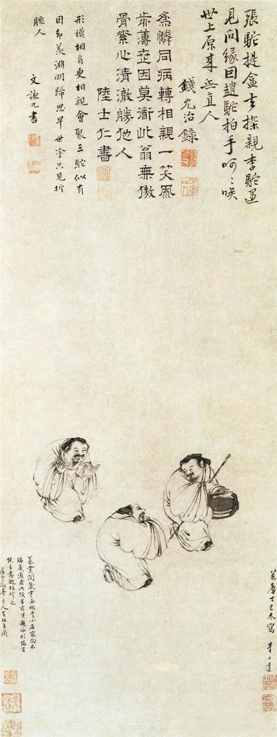 《三驼图》:这件作品是李士达的传世精品,作品描绘的是三个驼背的老人,一人向提篮的作揖,一个人则是拍手大笑,三人形象非常滑稽,笑态可掬。这也是一幅讽喻画,作者通过驼背老人之间的相互戏谑,来讽喻“世上无直人”的道理。人物的衣纹用“浑描”,须发皆不见钩勒痕迹,笔墨圆润,柔若无骨,可见作者高超的笔墨造型功力。上面钱允治题的诗:“张驼提盒去探亲,李驼遇见问缘因;赵驼拍手呵呵笑,世上原来无直人。”让人对作品的主题一目了然。