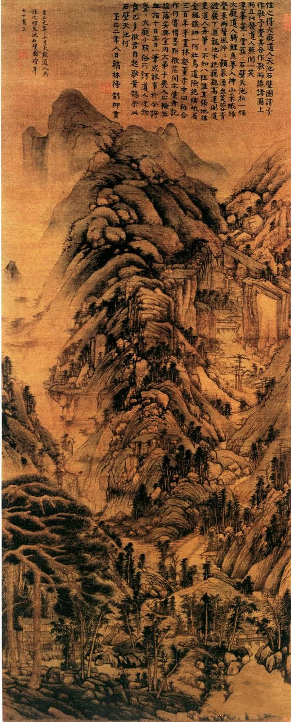 《天池石壁图》简介:绢本,立轴,浅绛;纵139.3厘米,横57.2厘米;藏于北京故宫博物院。