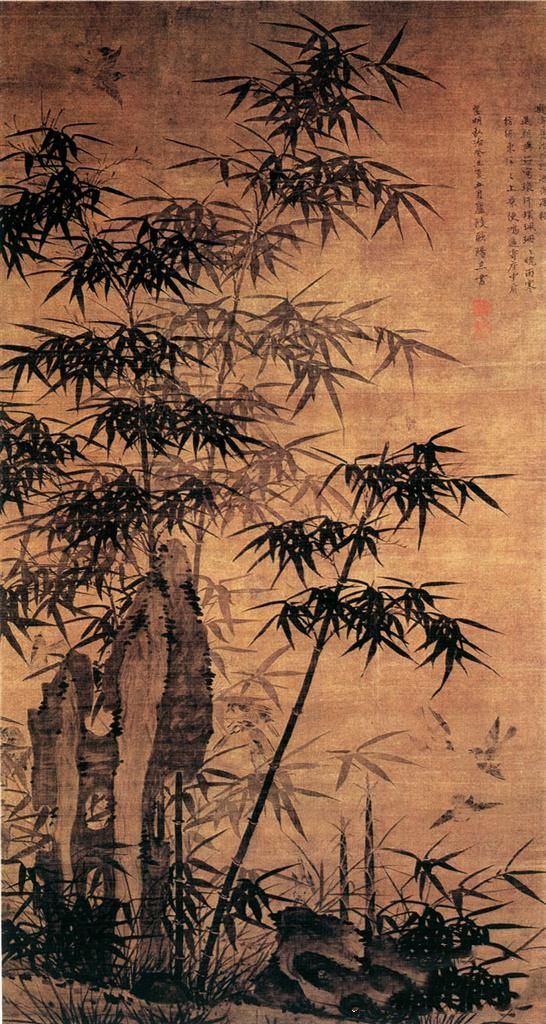 《竹雀图》简介:绢本,立轴,墨笔;纵153.2厘米,横84厘米;藏于北京故宫博物院。