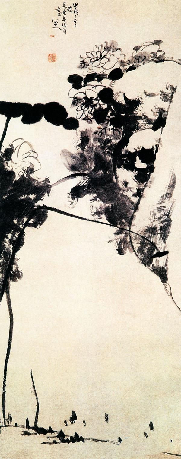 《水木清华图》:朱耷酷爱画荷花,他的国画作品的画荷的构图特点是绘以一花片叶然后留一大片令人寻味的“余白”。这件作品,我们可以很好的感受到他的这种画风,画面的左侧伸出几片荷叶,或大笔重捺,或泼墨大写,荷茎圆转苍劲,曲折舒张,荷花轻柔婉转。与它相对的画一倒悬危石,只略加勾皴,石顶一丛芙蓉,墨韵盎然。荷石在上相接,下方留白,中似无物却有空潆幽远之意。整幅画墨气纵横,用笔似游龙盘旋。