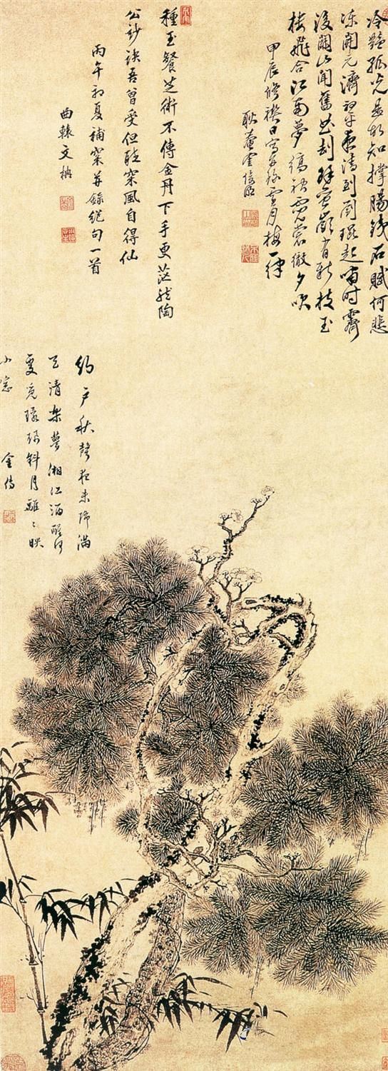 《岁寒三友图》:这件著名的传世国画作品《岁寒三友图》是由金俊明,文南和金传共同完成的,为金俊明写梅,文楠补松,金传添竹。梅树老干虬曲,新枝繁花竞发。青松昂扬郁茂,有藤萝缠绕,翠竹挺拔玉立。作者以松、竹、梅岁寒三友来表达彼此间的真挚友情。作品的上部有三人题词,金俊明书咏梅七律一首,文楠、金传各书七绝一首。