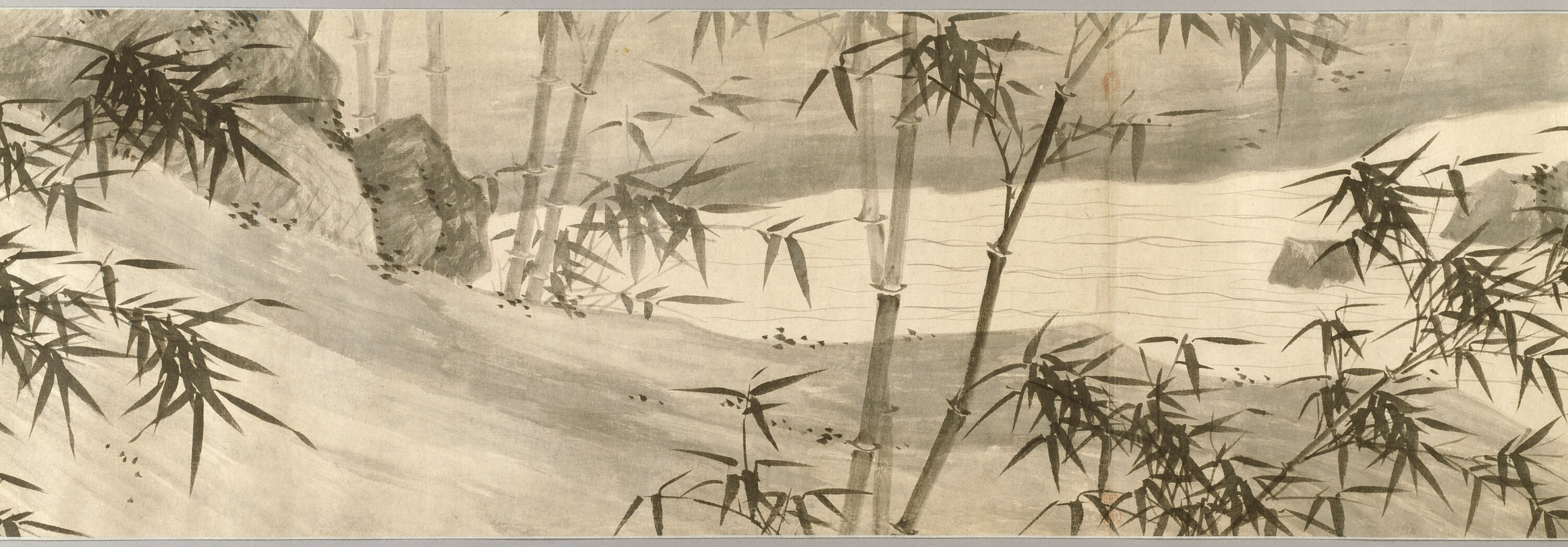 这种50英尺长的构图揭示了竹子沿溪流生长的“狭缝视角”。在具有不同音调的单个笔触中,叶子和茎杆被描绘得很近,在顶部和底部被切掉。夏畅以宽广和大胆的方式执行了这幅画,作为送给在他的退休别墅周围种上竹林的朋友的礼物。竹子弯曲而不会折断,唤起了人类对早现代中国知识画家的韧性和耐力的价值观。夏在卷轴上的专用铭文将竹园形容为“洗掉了普通的思想”,表达了他们渴望摆脱官场考验的渴望。他曾担任书法家,制图员和行政秘书一职,然后在1439年退休十年,最初是为了照顾年迈的母亲。这幅画展示了他那段时期逐渐成熟的棱角岩,墨迹斑斑的海岸线和流畅的笔法风格。