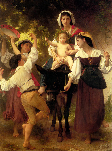 这幅画中突出的骑驴为布格罗提供了展示他惊人的技术技能和古典学识的机会,代表了一个古老的丰收节。骑驴的孩子扮演罗马神巴克斯的角色,伴随着欢乐的农民。此外,这幅画的主题带有圣经典故,孩子被认定为年轻的基督。这幅画是由具有爱尔兰血统的富有的美国百货商店老板亚历山大·T·斯图尔特 (Alexander T. Stewart) 委托创作的,他规定“这幅画是艺术家最伟大的作品,而不是裸体题材”。不幸的是,斯图尔特在布格罗完成这幅备受推崇的画作之前就去世了。