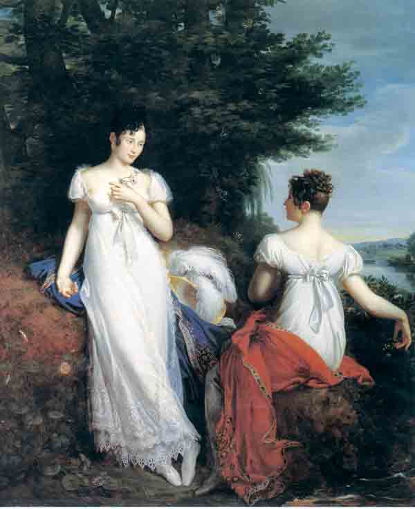 Pauline Borghèse 公主和她的朋友,Baroness de Mathisse,在 René–Théodore Berthon 的巨幅画作中为最新的时装做模特。作为拿破仑·波拿巴最小的妹妹,波琳被公认为时尚潮流引领者和传奇美女,同时也被誉为欧洲最丑陋的女性之一。在这里,她和她的朋友戴着围巾摆姿势,这是高端时尚的真正标志。披肩和其他中东和近东编织品被拿破仑的军官带到法国,它们很快成为时尚的异国配饰。鲜艳的色彩和装饰图案为帝国礼服的柔和造型带来轻盈感和视觉趣味。
