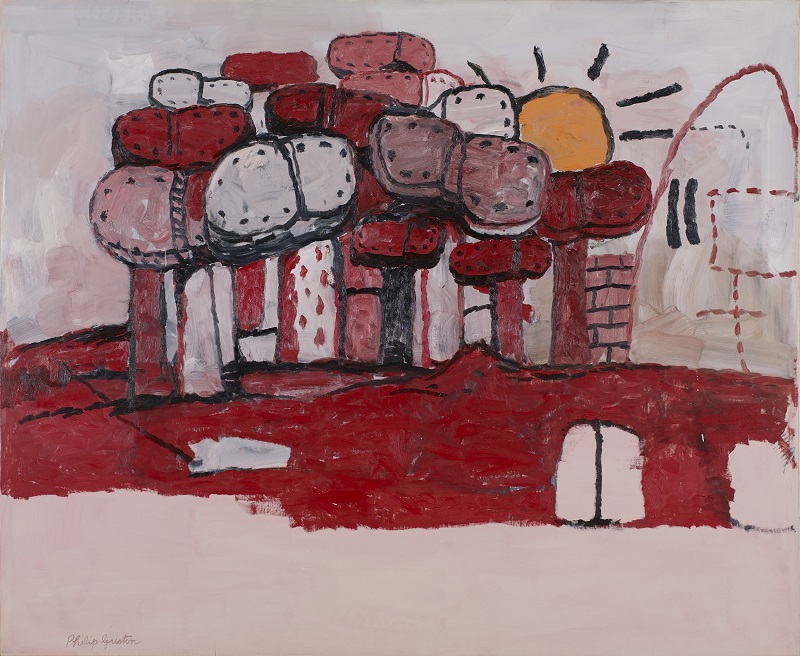 菲利普·古斯顿 (Philip Guston)的职业生涯始于为 Works Progress Administration 下的联邦艺术项目绘制社会现实主义壁画。1940 年代定居纽约后,他被抽象表现主义所吸引。然而,他最终在 1968 年放弃了抽象,以应对那个时代的社会动荡。受到他小时候喜爱的漫画书的影响,形成了一种高度原创的风格,古斯顿改变了他的做法,以应对他在美国生活中观察到的不公正和日益增长的恐惧、种族主义和暴力文化。虽然乘法的鲜艳色彩乍一看可能看起来很开朗,图平面右侧的连帽人物旁边是一双系在细腿上的鞋子,增添了一种令人不安的感觉。这个实体是一个反复出现的主题,将古斯顿的后期作品与他作为画家的成长岁月联系起来,当时他经常描绘私刑和装备三K党的野蛮题材。在作品的意象中嵌入了许多二元性。例如,在这个墓地般的场景中,这个人物让人想起死神——另一个不祥的、虽然是虚构的、披着斗篷的角色。同样,鞋底暗示了众多种族暴行受害者的灵魂。