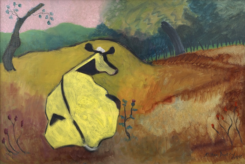 米尔顿·艾弗里 (Milton Avery) 热爱自然,经常用他活泼、有时甚至是超现实主义的调色板模糊现实的界限。安静幽默的田园风光有一头大黄牛在田野里安静地休息,背景是起伏的山丘。母牛的骨骼解剖结构仅用几条粗线条定义,在场景中占主导地位。它躺着,背对着我们。看起来柔软而圆润的黑色耳朵被一小簇白色的头发隔开,就像它头部两侧的触角一样。艾弗里在他的画作中有两个想要实现的目标,并评论说:“我试图构建一幅画,其中形状、空间和 [和] 颜色形成一组独特的关系,独立于任何主题。同时,我试图捕捉和翻译原始想法的影响所引起的兴奋和情感。”
