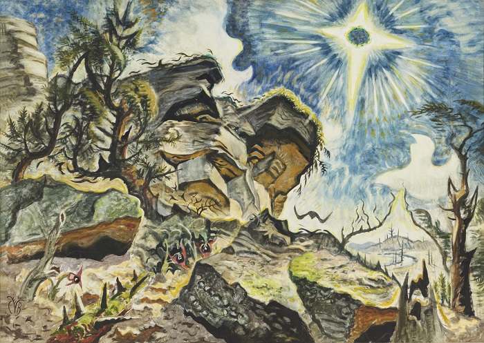查尔斯·伯奇菲尔德 (Charles Burchfield)利用他喜爱的水彩画创作了一种富有表现力的视觉图像,反映了他对自然的深刻尊重。他对风景的描绘通常被称为超然的,他相信这种品质存在于自然世界中,并促使他以自然的奥秘可以帮助他揭示内心情感的想法来处理他的作品。《太阳与岩石》在伯奇菲尔德这样描述的场景中探索了世界末日之美的主题:“从深蓝色的海绵状天空中闪耀,春天的太阳——我们伟大的白天之星——用灿烂的光淹没场景,将治愈地球和带来新的生命。”