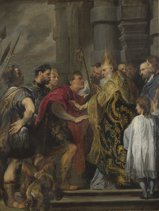在这幅画中,米兰主教圣安布罗斯(约 340-398 年)阻止狄奥多西皇帝(约 346-395 年)及其随从进入该市的大教堂。这是对狄奥多西屠杀塞萨洛尼卡人民的惩罚,他们杀害了他的将军布瑟里克。
