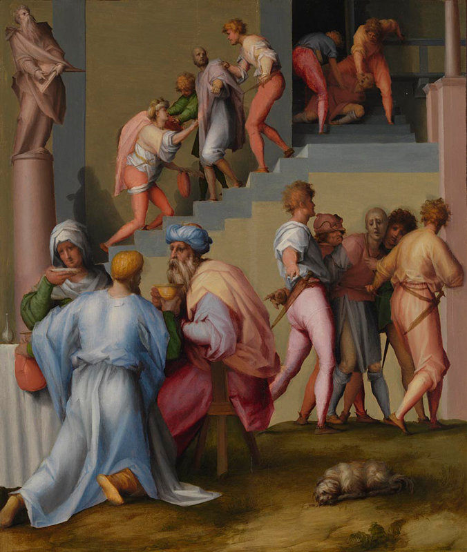 这是装饰皮尔弗朗西斯科·博盖里尼 (Pierfrancesco Borgherini) 在佛罗伦萨宫殿中卧室的面板之一。它们讲述了约瑟的旧约故事,最初很可能被镶嵌在家具中。该系列的其他五个面板也在国家美术馆。