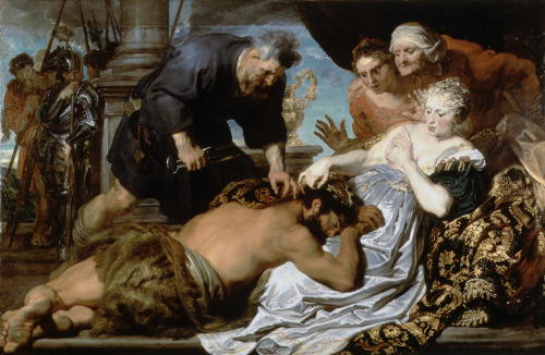 他的肤色各不相同,因为参孙醉醺醺的脸上涂上了柔和的棕色和红色调。Delilah 是纯白色的,van Dyck 使用明亮的白色光泽(很可能是粉笔)来突出她的美丽。