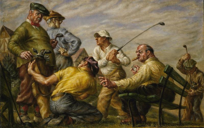 高尔夫来自保罗卡德摩斯的郊区生活系列,该系列受财政部浮雕艺术项目委托制作了一幅从未完成的邮局壁画。这幅画中大肚子的高尔夫球手更关心的是下颚骨和抽雪茄,而不是完善他们的挥杆,其中两个似乎全神贯注于等待他们出价的年轻、肌肉发达的球童。球童穿着穷人的衣服,卡德摩斯在这个年轻人的鞋子上打了洞,以强调他和他们的社会阶层之间的距离。