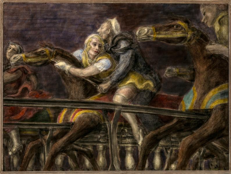 雷金纳德·马什,乔治·蒂尤的《障碍赛跑》,1932 年,亚麻布上的油彩和蛋彩画,安装在纤维板上,史密森尼美国艺术博物馆。 障碍赛公园是布鲁克林康尼岛的三个游乐园之一。在这里,马什展示了一对骑着机械马的夫妇,它们在铁轨上绕着乐趣亭赛跑,铁轨在某些地方高达离地面三十五英尺。水手和女孩的嵌套身体散发着年轻爱情的激情,尽管女人脸上紧张的表情可能表明他们的感情是短暂的。