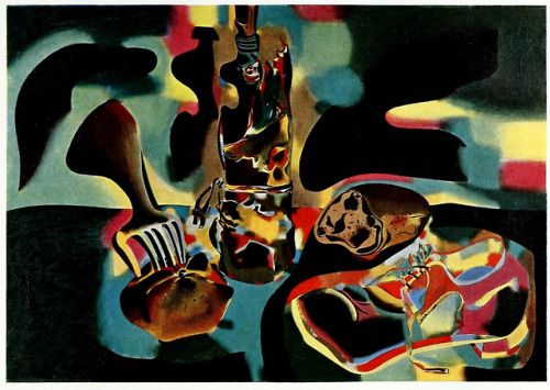 《穿鞋的静物》是米罗最奇怪和最重要的画作之一,他表达了他对西班牙局势的担忧和痛苦,由于内战完全掌握了西班牙的局势,西班牙局势已经完全毁灭。事实上,他试图通过这幅画来描绘完全残废人类生活的战争的邪恶和可怕的力量。左边是一个被叉子和鞋子刺穿的苹果。红色、酸性黄色和黑色是画布的主色调,象征着灾难性的风景。地平线上的圆形线条营造出一种活力感,而地平线上的抽象形状就像预示着悲剧开始的乌云。据说这部作品与毕加索的《格尔尼卡》有着惊人的相似之处,因为它描绘了荒凉感和战争的毁灭性主题。
