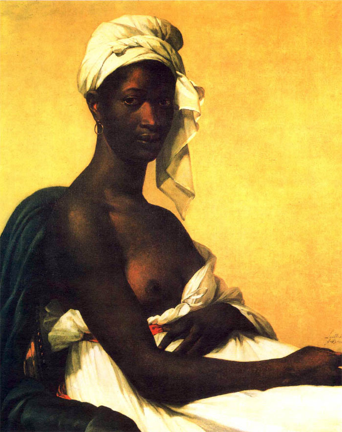 《黑人妇女像》创作于1800 年,正值颁发了废除奴隶制的法令,画家受此激励而作此画。画中描绘了一个黑人妇女的半身像,这在19 世纪法国绘画史中是绝无仅有的。肖像的画风严谨,模特儿采用古典式姿态,披着古罗马的白色裙衫,上身裸露一乳房,头上缠一块白色头巾。这幅画可能是画室内 完成的长期作业的成果。黑女人的形象健美、丰满,其棕色的皮肤与白色的头巾与裙子形成鲜明的对比,束腰的橙红色腰带与古典坐椅上绿色的丝绒椅罩在画面上形 成鲜明的点缀,典雅的色彩在淡黄色的背景上异常赏心悦目。