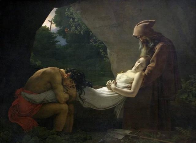 安内.路易.吉隆德,还是大卫的学生,新古典画派,阿塔拉的葬礼,1808年拿破仑战争时期的作品,“画家运用古典主义手法,描绘了少女阿塔拉入葬的情景。年青的恋人抱住阿塔拉的脚不忍离去;画家娴熟地表现了这一幕生离死别的场景。古典主义的冷静手法,使人物刻划显得含蓄,他们将悲哀藏在内心,并不过于外露,更增强了悲剧性的艺术效果。画面色彩单纯而不失丰富,凝重而又富于情感。