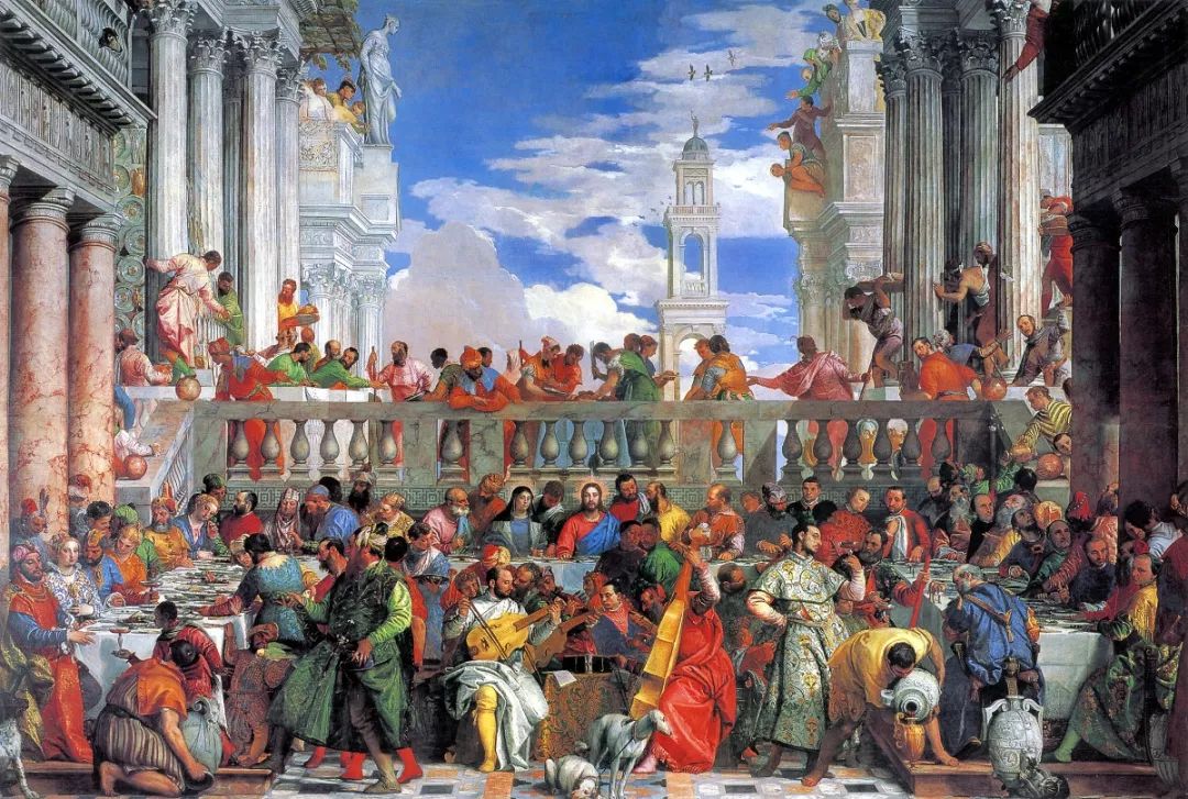 《迦拿的婚筵》是幅70平米的巨作,原是为修道院餐厅做的装饰画。表现基督参加婚宴的情景。古典建筑围绕著的豪华庭院中,成百宾客饮酒庆贺,乐师仆役穿插其间。人物栩栩如生,色调光彩夺目,现实人物和世俗生活融汇进圣家族的宴会,呈现出富丽堂皇的景象。