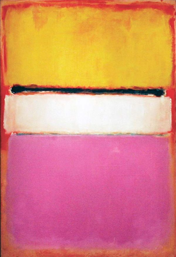 马克·罗斯科专注哲学命题,深入生命本质,以完全抽象的色域绘画风格表达出的情绪本身,色块仿佛悬浮于背景之中,让人感受到宇宙和宗教。《白色中心》以白色居中,夹着黄色、桃红和玫瑰紫。极为精简的构图之上,色彩的感觉被无限放大,散发出具有象征意味奥妙的美感,引发强烈的心理共鸣和情感震撼。