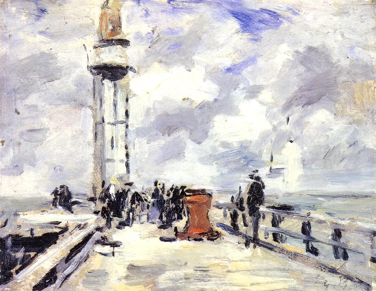 布丹用极为狂放的笔触和色块记录下翁费勒尔堤岸的人群和灯塔,尤其是乌云翻滚的天空。在画家的眼里,天空、云层、灯塔和人群只是不同形状的色块而已,他们之间并没有什么不同。他以急速的笔触描绘下来,令人感到非常真实。