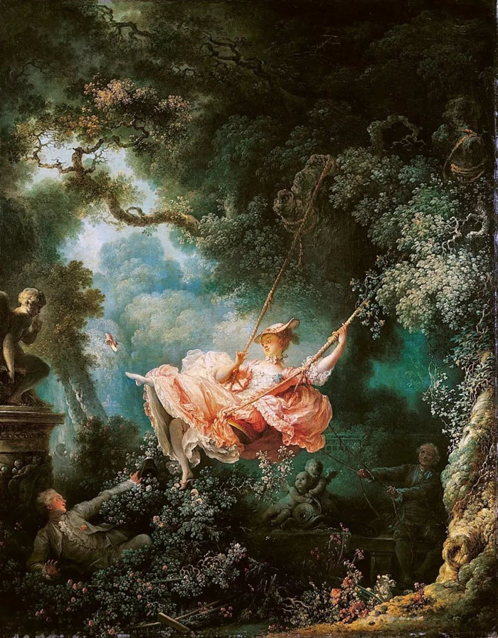 作为18世纪艺术最知名的图像,弗拉格纳尔的《秋千》体现了洛可可艺术的优雅和俏皮。右侧阴影中的丈夫正在推秋千,左侧则是藏在灌木丛中的情人。两位倾慕者同时沐浴在阴影中,但情人伸展的臂膀有明显的雄性气息。弗拉格纳尔将荡秋千的主题处理成不贞的象征,通过添加机智的细节体现了自己的风格。