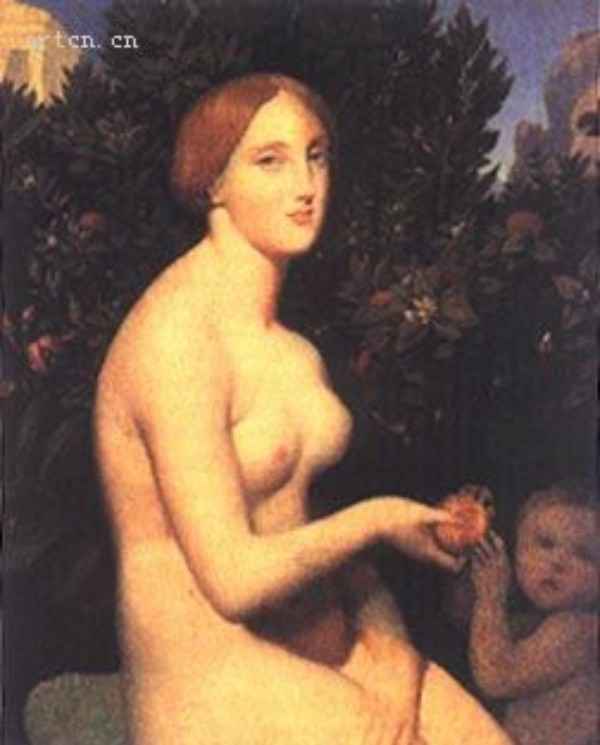 该画与《泉》作于大致相同时期,风格和《泉》接近。这是安格尔未完成的作品之一,在画面中,我们可以清晰的看到维纳斯左手及水果边的小孩尚未深入刻画,惟有个大致的轮廓。但这并没有破坏整个画面的可审美性。维纳斯宁静地坐在石板上,体态丰满,曲线优美,右手拿着水果,左手则平放在大腿上。在简约而富有变化的线条中显示出她母性的成熟。整个画面以深冷色为背景,突出了人体的美。