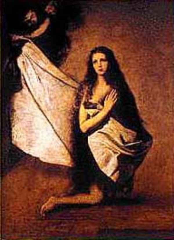 《圣埃格尼丝》就是这样一幅世俗化的宗教画代表作,它创作于1641年,是里贝拉艺术达到盛期的杰出作品。圣埃格尼丝在基督教传说中是罗马时代的基督徒,那个时代,基督教是非法宗教。埃格尼丝宣称她除耶稣之外,别无所爱,并立誓不嫁。这引起求婚者疯狂的怒火,就揭发她信仰基督教,结果被投进监狱,卖入娼门,她因此而以身殉教。画上表现的是埃格尼斯被投入监狱时的情景,她正跪在地上虔诚地祈祷,神派下天使降下圣衣,遮裹了她赤裸的身体。据说,画中的埃格尼丝是作者自己女儿的形象。她虽娇小纤弱,但不畏强暴。里贝拉画这位圣女,与其说是对上帝表示虔诚,还不如说是在歌颂西班牙人对信仰的坚定和一种大无畏的精神。整幅画,朴实、有力,人物形象自然,毫不造作。明暗关系强烈,用色粗犷,但却柔美。