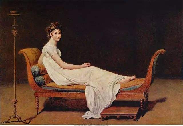 雅克-路易・达维德《雷卡米埃夫人像》 达维德的肖像画被公认具有永恒的价值,无论是线条,还是色彩,即平滑又富有个性,并保持着人们赞赏的理性美。雷卡米埃夫人是19世纪初法国上层贵族中一位年轻的银行太太,她在文化界有很高的地位,她的美貌与聪颖,曾使不少人为之倾倒。这里,雷卡米埃夫人身着罗马式长袍,靠卧在罗马式卧榻上,道具有古代铜灯,背景是一块素朴的布幕,夫人白色长袍垂搭在靠榻前,色彩与形体相谐,呈现一种高雅古朴的休憩状态。整个画面呈现出极富古代气氛的典雅环境,体现了新古典主义的风格特点。