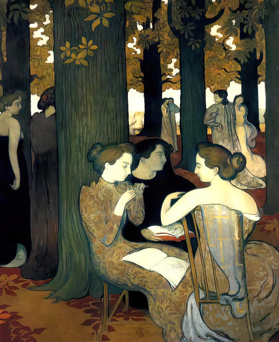 在坐在前景的三名女性中,我们可以看到 Marthe 的身影,这位画家于 1893 年 6 月结婚,并一直启发他的艺术直到她去世。在丹尼斯作品中常见的一种装置中,她出现了两次:红色侧面和背面,坐在椅子上。莫里斯·丹尼斯 (Maurice Denis) 将场景设置在圣日耳曼昂莱 (Saint-Germain-en-Laye) 的露台上,这是他一生居住的小镇。百年栗树赋予作曲韵律和装饰力量。树干的规则笔触是玩垂直线的借口,与树枝的曲线和装饰性蔓藤花纹、散落在地上的树叶以及连衣裙的图案和褶皱形成鲜明对比。线条和交错的图形游戏被虚幻的秋天色彩强化,涂在平坦的颜色区域并整齐地勾勒出来。平坦的空间是“圣木”的空间,是启示的背景,也是人物与自然和超自然力量的神秘交流。背景中有一位神秘的第十位缪斯女神(虽然传统上只有九位),一只手臂举到天空的光线下,让我们相信这一点。