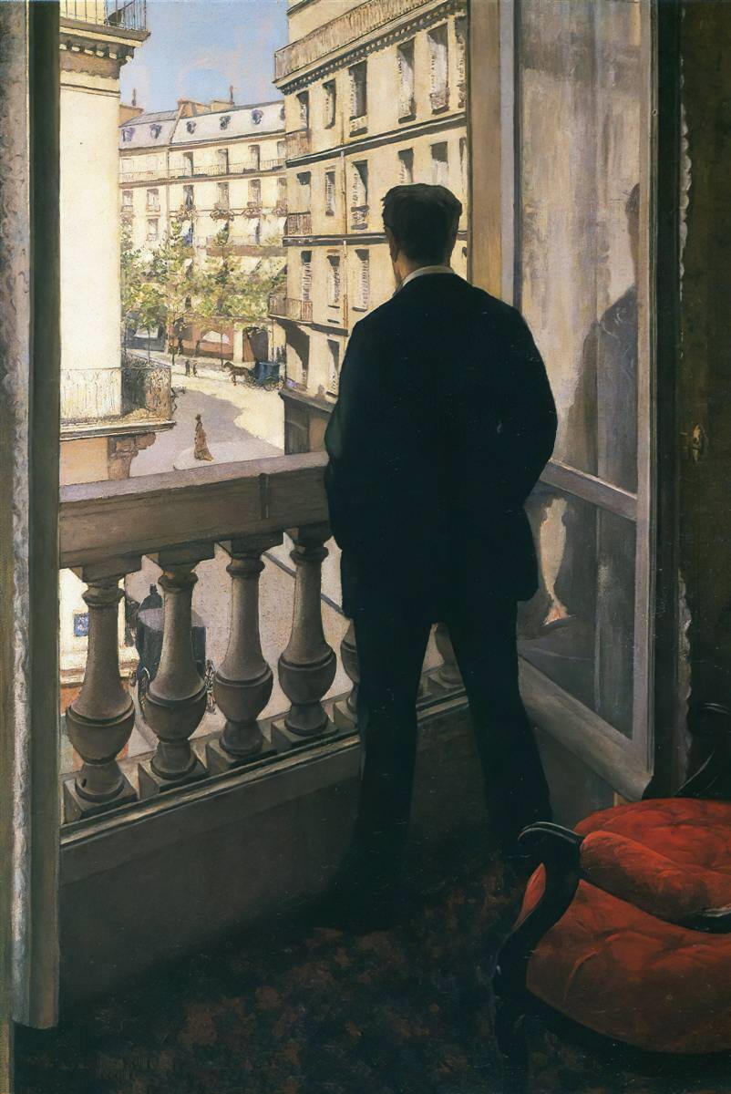 Gustave Caillebotte 是一位法国印象派艺术家,他的风格比其他艺术家更加写实。他努力在没有戏剧的情况下描绘现实。在母亲去世后,他对摄影的兴趣与日俱增,对城市景观的关注也更加强烈。我们在他的画作《窗边的人》中看到了德国浪漫主义的影响,但用城市景观取代了甘美的自然景观。他画了他的兄弟 René Caillebotte,穿着非正式的衣服,站在阳台上。椅子和地毯强调了人物的社会地位。优雅的法式建筑一直延伸到外部,建筑物排列在道路上,通向十字路口。当这幅作品展出时,一些评论家表示失望,因为有许多相同概念的画作,似乎卡耶博特抄袭了作品。