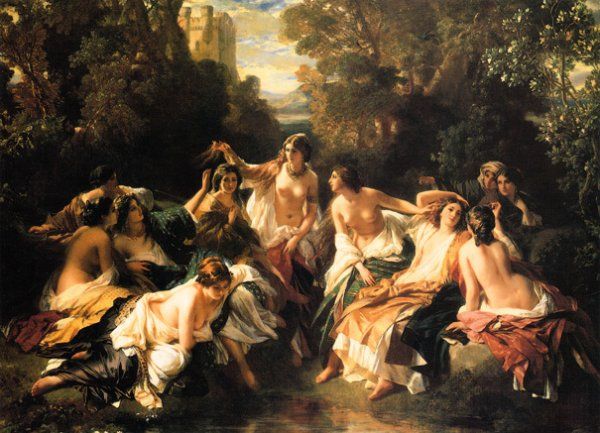 《芙林达》:此作为弗朗斯·克萨韦尔·温特哈尔特的传世名作,作品中十几个美丽少女,围坐溪边,似乎欲下水洗浴,有的半裸,有的欲脱衣。画家把不同性格、气质的少女组织在一起,强调个性,又要找出共性,去体现那种生命之美。在无序中实现有序,繁纷中实现统一,是这幅作品的成功之处。