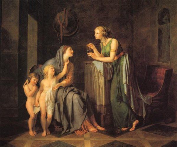 《科内亚》:此作为一幅具有新古典主义风格的绘画,却又充满了温馨的人情味,当然,也并不缺少古典理性的冷静。故事似乎是一个贫苦的母亲带着两个可爱的孩子,来到一位主妇家,善良美丽的主妇同情母女三人,便赠送给她们一串金项链。这是一个戏剧性的场面,古典主义的绘画技巧,把人物描绘得身材修长丰满,衣纹褶皱流畅而富于质感。但是,古典主义法则的理性,妨碍了激情的表达,因此,虽然人物面孔含蓄,却给人以一种高贵、宁静之感。