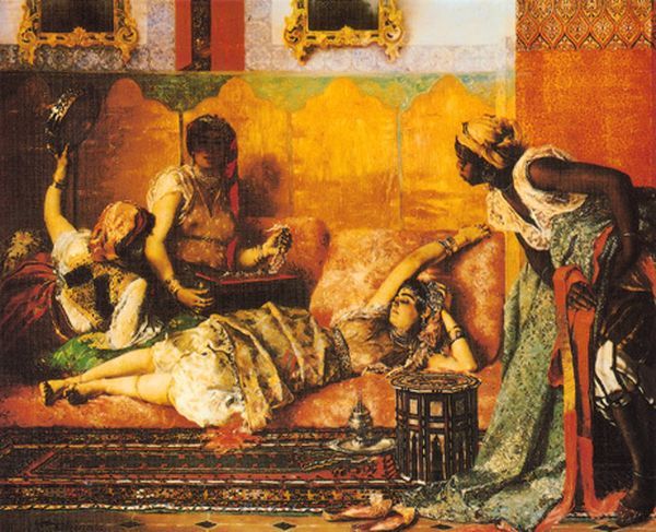 《试装》:此作为一幅极富装饰意味、色彩瑰丽的作品。在一间装饰豪华的房间里,三位女佣正在为女主人试装,珠光宝气的女主人正昏昏欲睡,热烈的调子与明快的色彩、轻松的笔触,构成了阿拉伯风情背后隐秘的情景。就艺术而言,色彩处理、人物造型与情绪把握都十分成功。
