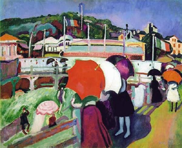 杜菲《三支雨伞》简介:外文名The Three Umbrellas;画布,油彩Oil on canvas;纵60厘米,横73.6厘米;作于1906年;藏于美国德州休斯顿美术馆useum of Fine Arts, Houston。