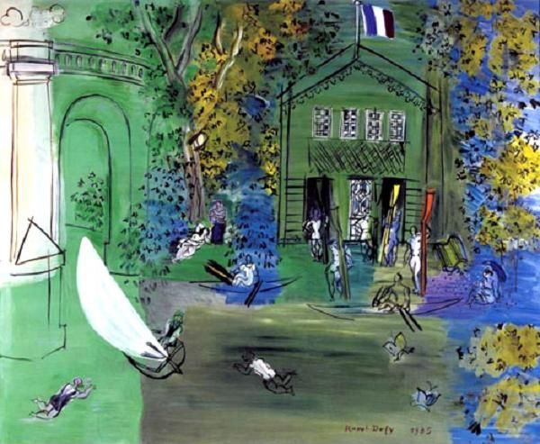 杜菲《马恩河畔》简介:外文名Nogent-sur-Marne;画布,油彩Oil on canvas;纵130厘米,横161厘米;作于1935年;藏于私人private collection。