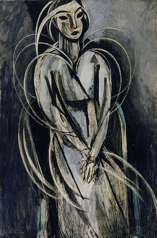 马蒂斯《伊冯·兰茨贝格夫人肖像》:在马蒂斯的这件作品中,伊冯·兰茨贝格夫人带着一个面具,两眼空洞,没有露出真实的脸,她的身体像一朵心状的花般开放。这绝对是她,从她头发的一部分到她长长的手指,我们都可以看出来。一切都在面前,虽然无法辨识,然而可以理解,这是最古典的安排:一位年轻女子,从近处取景,坐在扶手椅上。淡绿松石色的椅子扶手,在深灰色的背景中脱颖而出,背景就像雷声响过后的天色般阴沉。她的裙子领口略低,浅紫色如同暗影,下面是雅致纤美的身躯。她就坐在那里,她的手交叉着放在膝盖上。整个画面布满温柔的灰,间或点缀着蓝,给人以视觉上的强烈冲击。