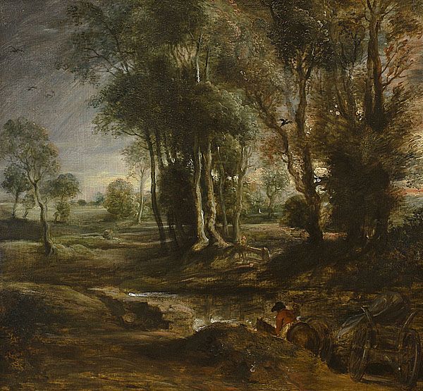 鲁本斯《晚上运木材的马车》简介:外文名Evening Landscape with Timber Wagon;画布,油彩 oil on canvas;纵49.5厘米,横54.7厘米;作于1630 - 1640 年;藏于荷兰鹿特丹布尼根博物馆 Museum Boijma Van Beuningen, Rotterdam。