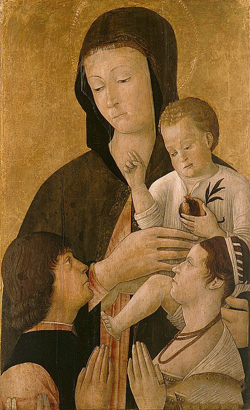 乔凡尼·贝里尼《圣母子与两位施主》作品介绍:外文名Madonna with child and two donors;画布、油彩oil on canvas;纵73.5厘米,横45.5厘米;作于1460年;藏于德国柏林国立博物馆绘画陈列室 Gemaldegalerie, Staatliche Museen, Berlin