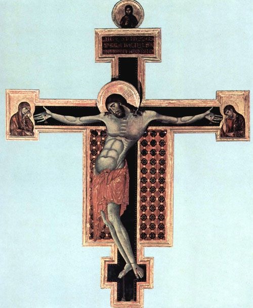 契马布耶《钉刑图》作品介绍:外文名Crucifix;木板,蛋彩Tempera on wood;纵336厘米,横267厘米;作于1268 - 1271 年;藏于大利圣多明尼哥教堂。