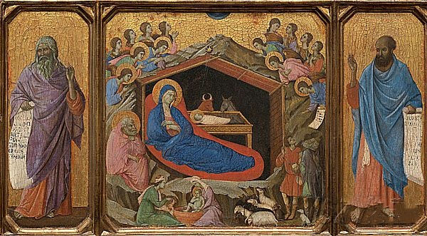 杜奇欧《耶 诞生的先知以赛亚和以西结书》作品介绍:外文名The Nativity with the Prophets Isaiah and Ezekiel;木板,蛋彩tempera on wood;纵48厘米,横87厘米;作于1308 - 1311年;藏于美国华盛顿区国家画廊 National Gallery of Art at Washington,DC。